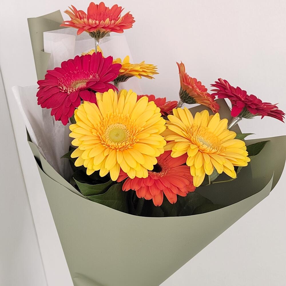 Зелень – 5 шт.Лента атласная – 1 шт.Гербера – 9 шт.Упаковка дизайнерская – 1 шт.