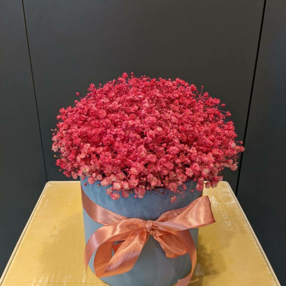 Гипсофила – 7 шт.Шляпная коробка – 1 шт.Лента атласная – 1 шт.Оазис – 1 шт.