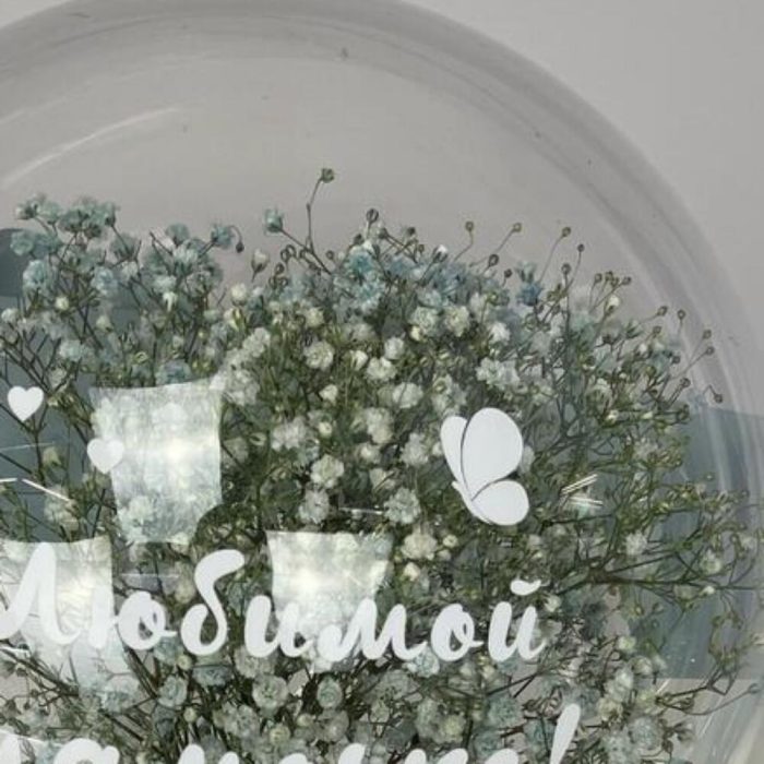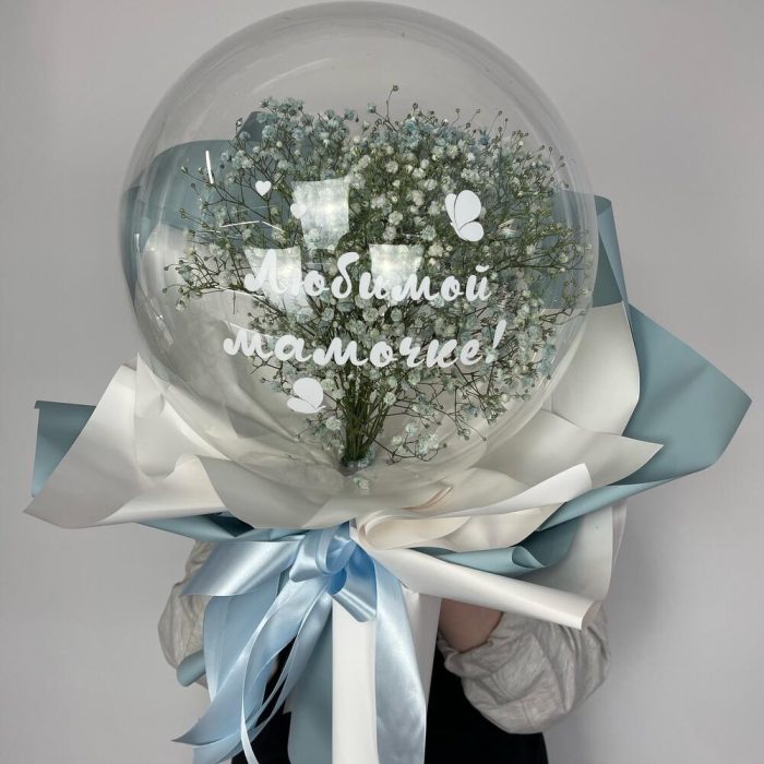 шар бабл – 1 шт.Гипсофила – 3 шт.наклейка фирменная – 1 шт.покнка матовая – 6 шт.Лента атласная – 4 шт.