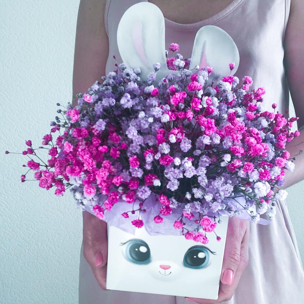 гипсофила цветная – 5 шт.коробка зайка – 1 шт.Тишью – 4 шт.Оазис флористический – 1 шт.упаковка транспортировочная – 1 шт.инструкция по уходу за цветами – 1 шт.