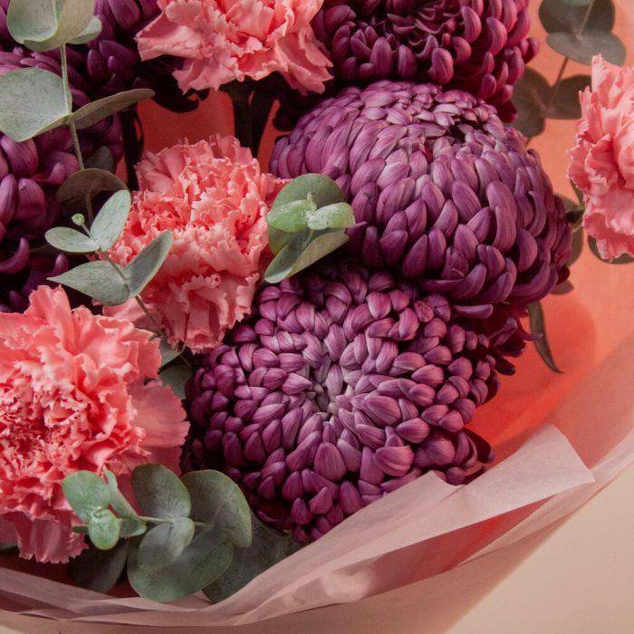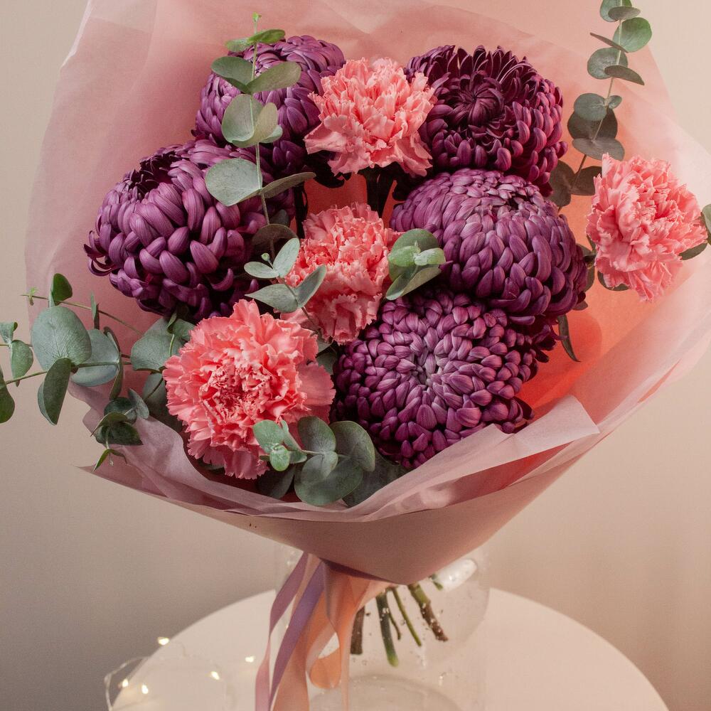 Гвоздика – 4 шт. Хризантема одноголовая – 5 шт. Эвкалипт – 2 шт. Оформление – 1 шт.