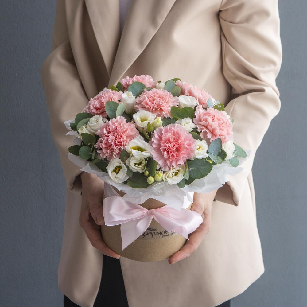 Эвкалипт – 8 шт.Гвоздика розовая – 7 шт.Коробка шляпная – 1 шт.Оазис кирпич – 1 шт.эустома белая – 2 шт.