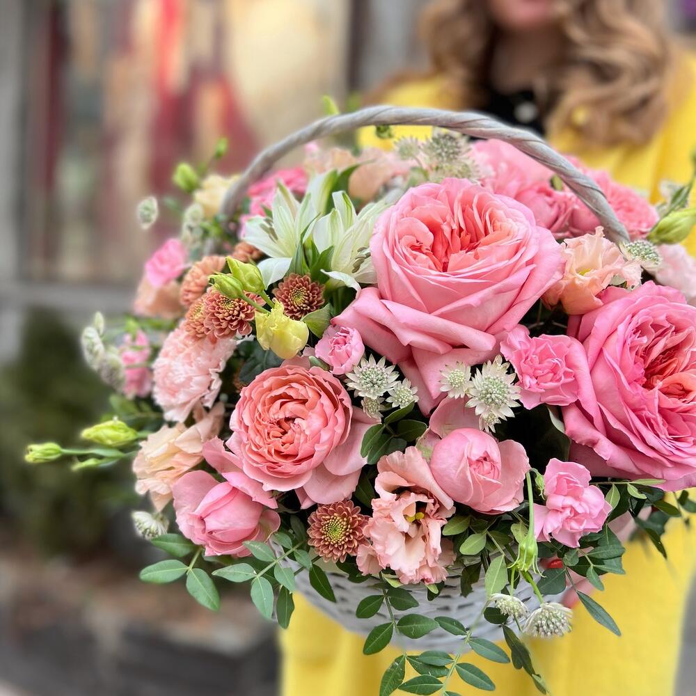Роза пионовидная – 4 шт.Роза кустовая пионовидная – 2 шт.Лизиантус – 2 шт.Астранция – 3 шт.Диантус – 6 шт.Альстромерия – 2 шт.Сантини – 3 шт.зелень декоративная – 7 шт.Флористическая губка – 2 шт.