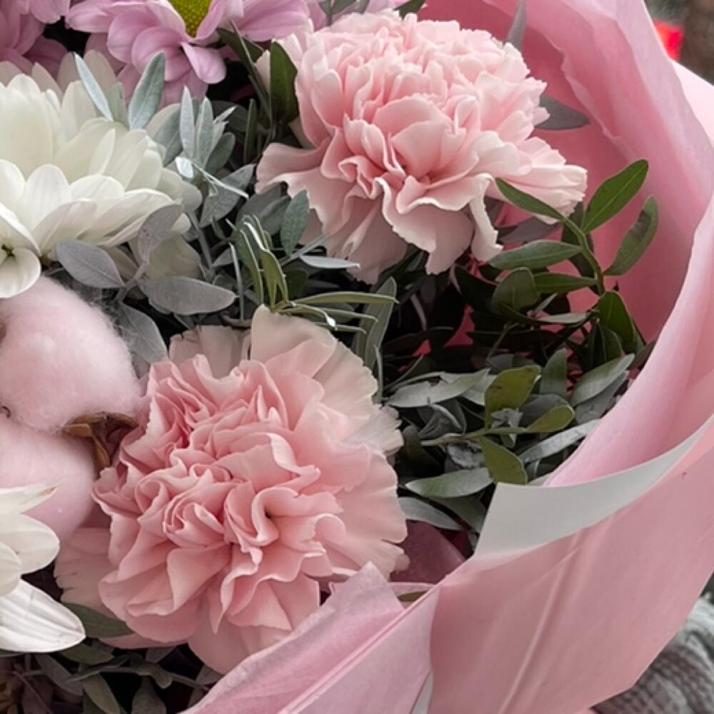 Хлопок – 3 шт.Хризантема кустовая – 4 шт.Гвоздика – 3 шт.Лента атласная – 2 шт.Фисташка – 5 шт.Упаковка дизайнерская – 2 шт.