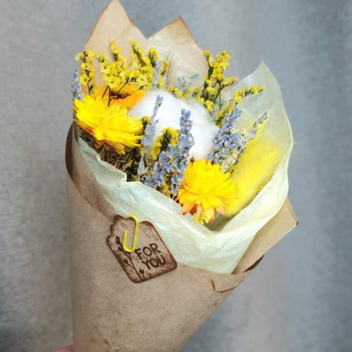 Хлопок натуральный – 1 шт.лавандин пучок – 1 шт.Гелихризум – 3 шт.Лагурус – 3 шт.статица стабилизированная пучок – 1 шт.Упаковка дизайнерская – 2 шт.