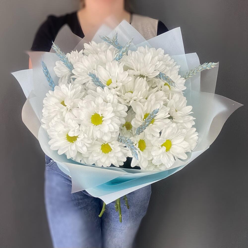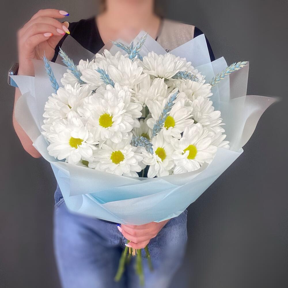 Лента атласная – 1 шт.Сухоцветы – 11 шт.Хризантема Ромашковая – 5 шт.Пленка матовая – 3 шт.тишью голубое – 2 шт.