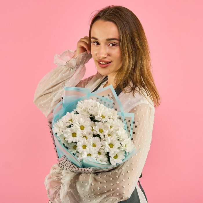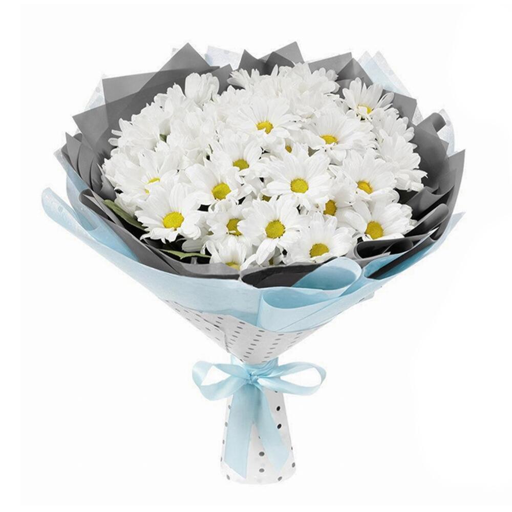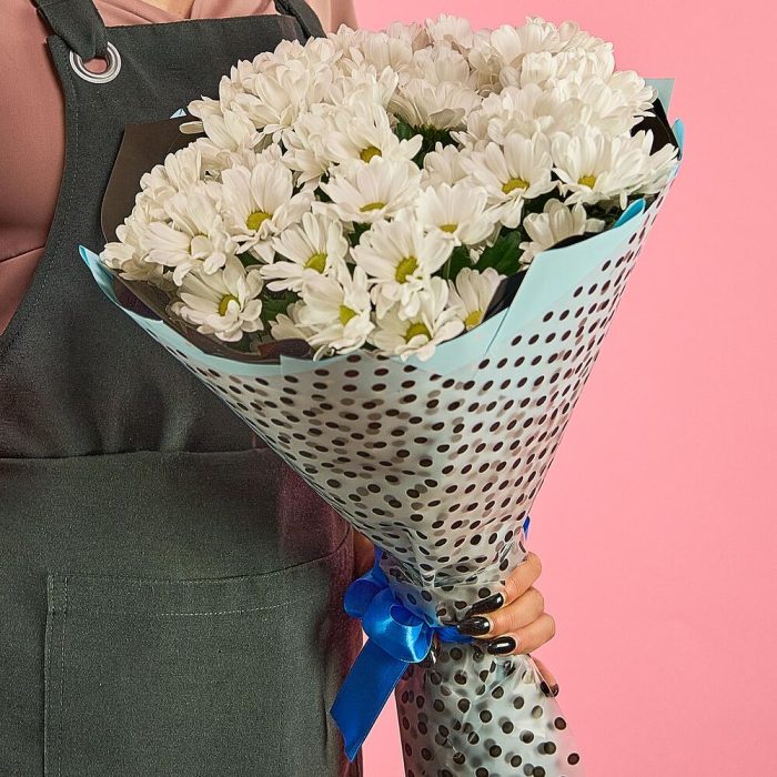 хризантема кустовая (белый) – 7 шт.пленка цветная – 1 шт.лента атласная (синий) – 1 шт.