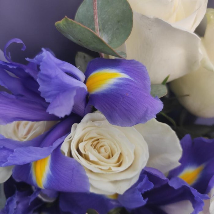 ирисы синие – 8 шт.розы белые mondial – 7 шт.зелень фисташка и эвкалипт – 1 шт.Упаковка матовая пленка – 1 шт.Атласная лента – 1 шт.