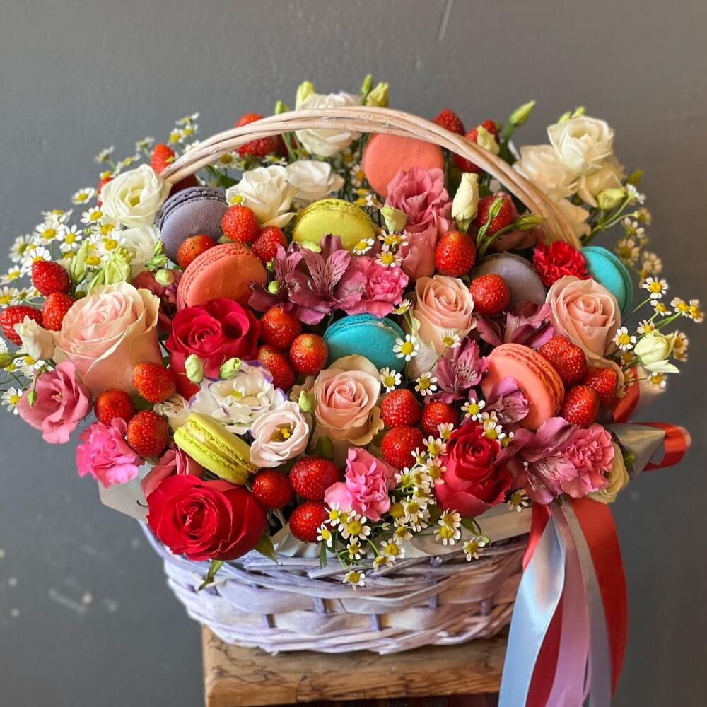 Альстромерия – 5 шт.Клубника – 21 шт.Роза – 11 шт.Эустома – 7 шт.Лента атласная – 4 шт.Матрикария – 7 шт.Корзина плетеная – 1 шт.Макарон – 11 шт.Оазис флористический – 1 шт.пленка транспортировочная – 1 шт.работа флориста – 1 шт.
