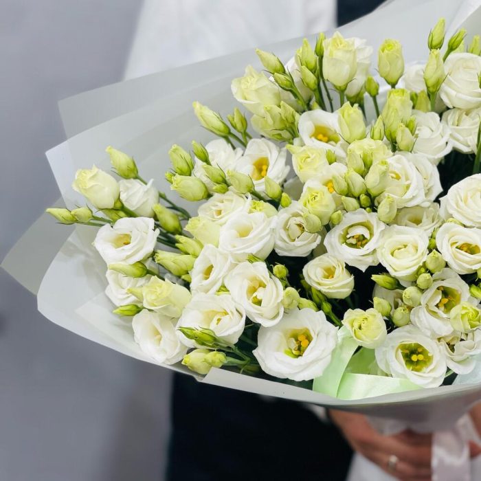 Такие нежные , белоснежные колокольчики эустом собраны в белую упаковку подарят весь спектр эмоций получателю . Эустома очень стойкий цветок. Букет будет радовать получателя продолжительное время при правильном уходе за ним.Уход :1. После доставки букета обязательно подрежьте стебли на 1-2 см под косым углом. 2. Налейте воду в вазу минимум 2/3 от высоты букета . 3. Меняйте воду , мойте вазу и подрезайте стебли каждый день. 4. Храните Цветы подальше от солнечных лучей, тепло-обогревателей, фруктов и сквозняков. 5. Если букет был доставлен в минусовую температуру, дайте цветам полежать 15-20 минут для того , чтобы они могли принять комнатную температуру. Затем подрежьте стебли и поставьте в вазу.