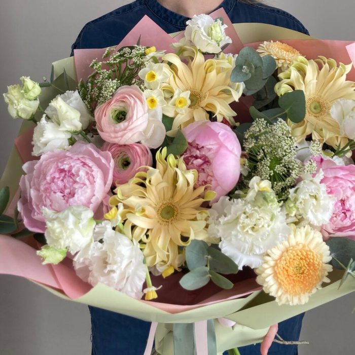 Пион – 3 шт.Ранункулюс – 3 шт.гербера кучерявая – 3 шт.Амми – 3 шт.Лизиантус – 3 шт.Нарцисс – 3 шт.Гербера мини – 3 шт.Эвкалипт – 6 шт.Упаковка – 1 шт.