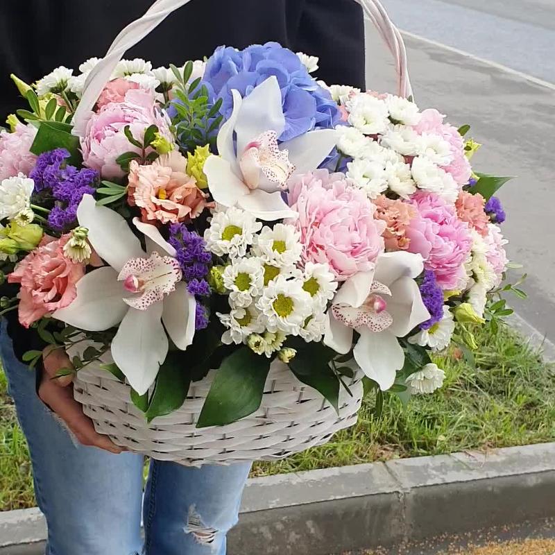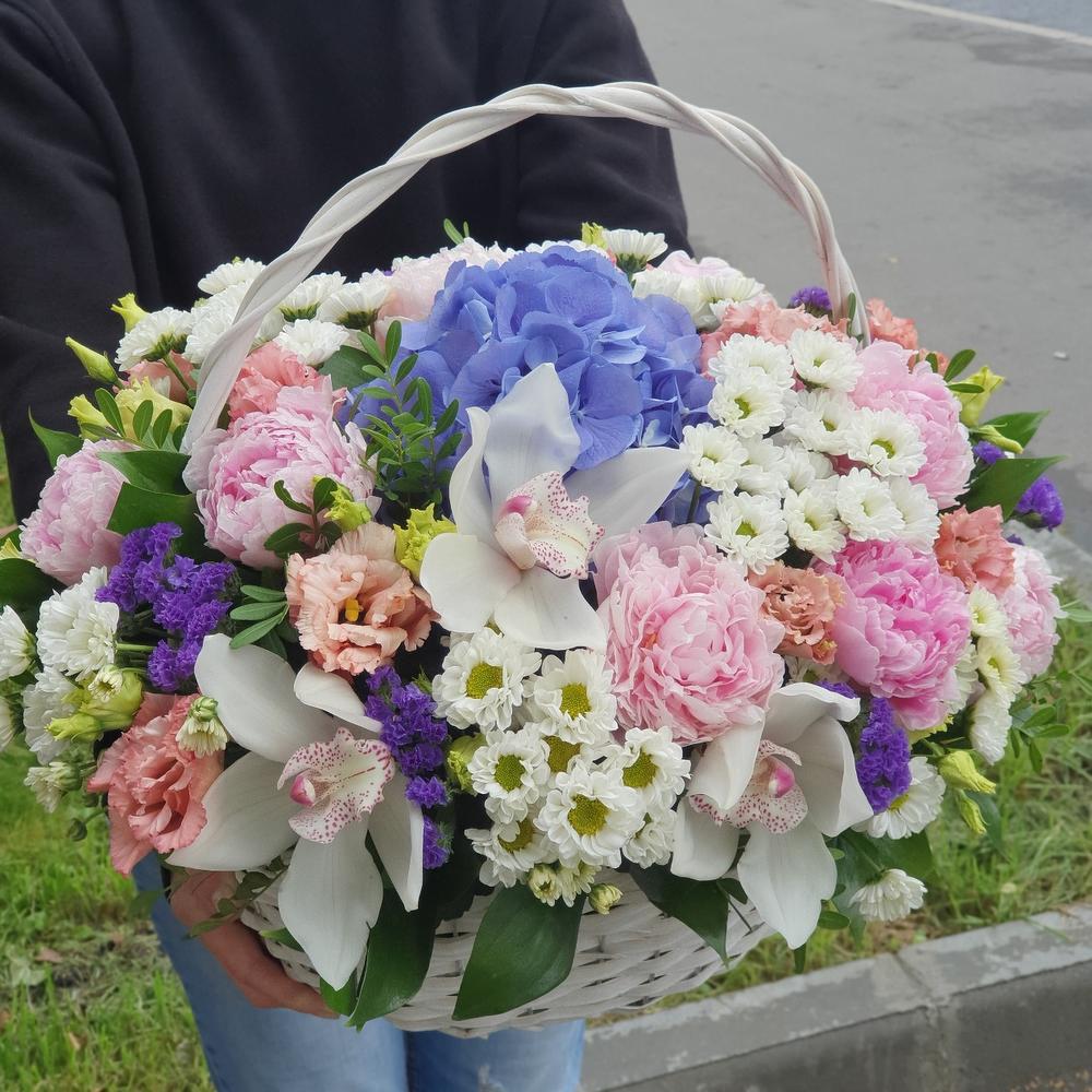 Корзина – 1 шт.Оазис флористический – 2 шт.Гортензия – 1 шт.Пион – 9 шт.Орхидея Цимбидиум – 3 шт.Статица – 3 шт.Лизиантус – 4 шт.Сантини – 5 шт.Зелень – 10 шт.