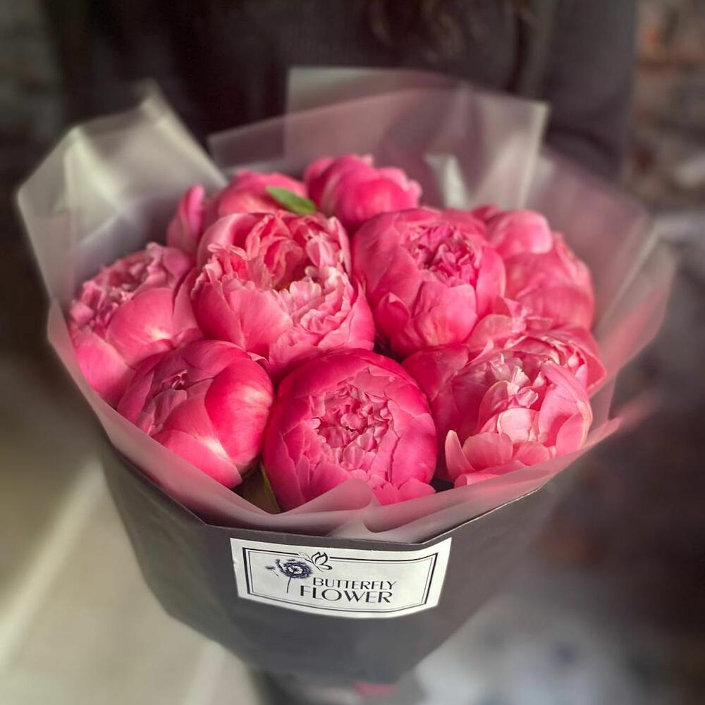Букет из 9 ярко-розовых пионов в дизайнерской упаковке “Корал Шарм”