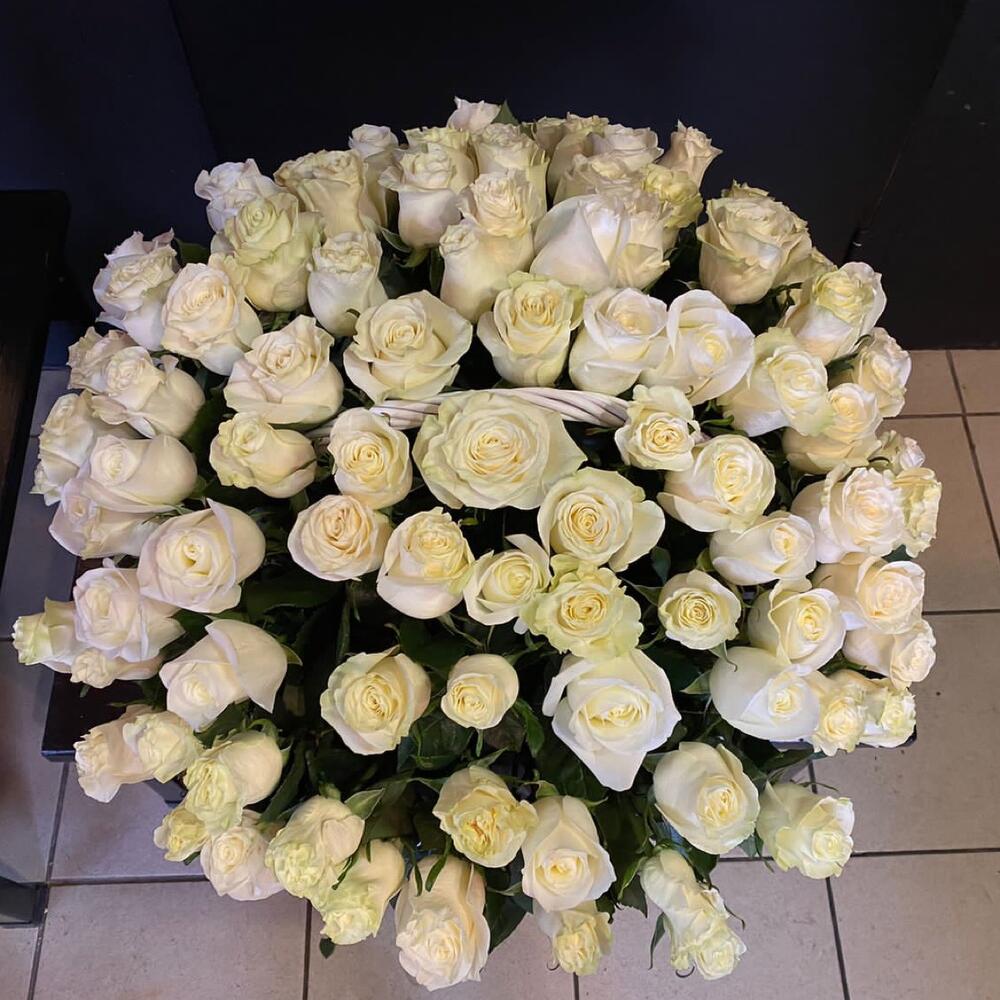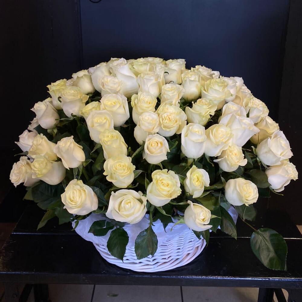 Метки: 101 роза, от 5000 руб, цветы в корзине