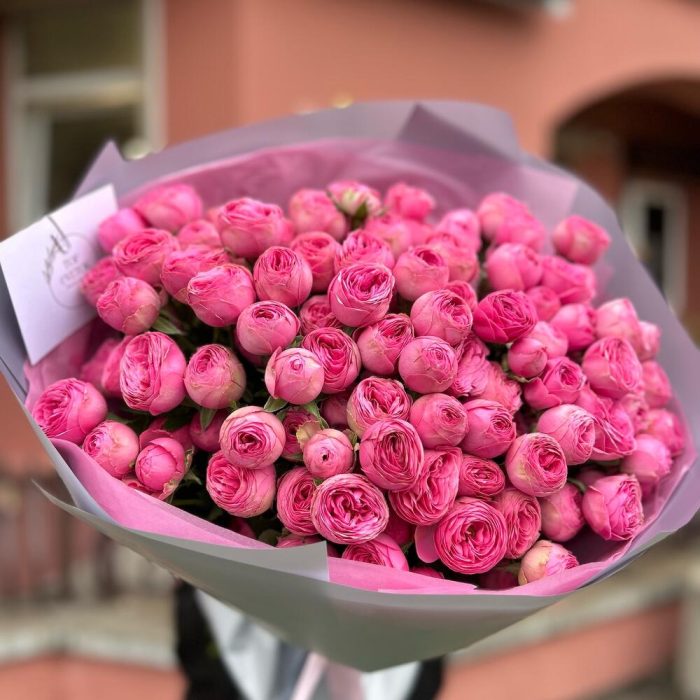 Тишью – 1 шт. Атласная лента – 1 шт. Кустовая пионовидная роза – 25 шт. Дизайнерская упаковка – 1 шт.