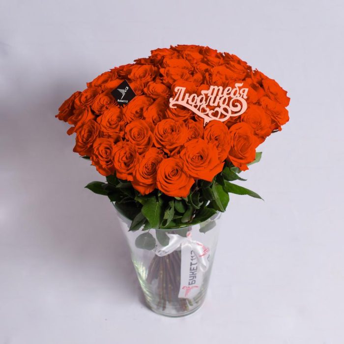 роза нина 50 см – 51 шт.Топпер деревянный – 1 шт.Пленка прозрачная – 1 шт.Лента атласная – 1 шт.