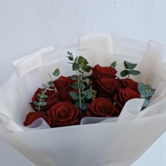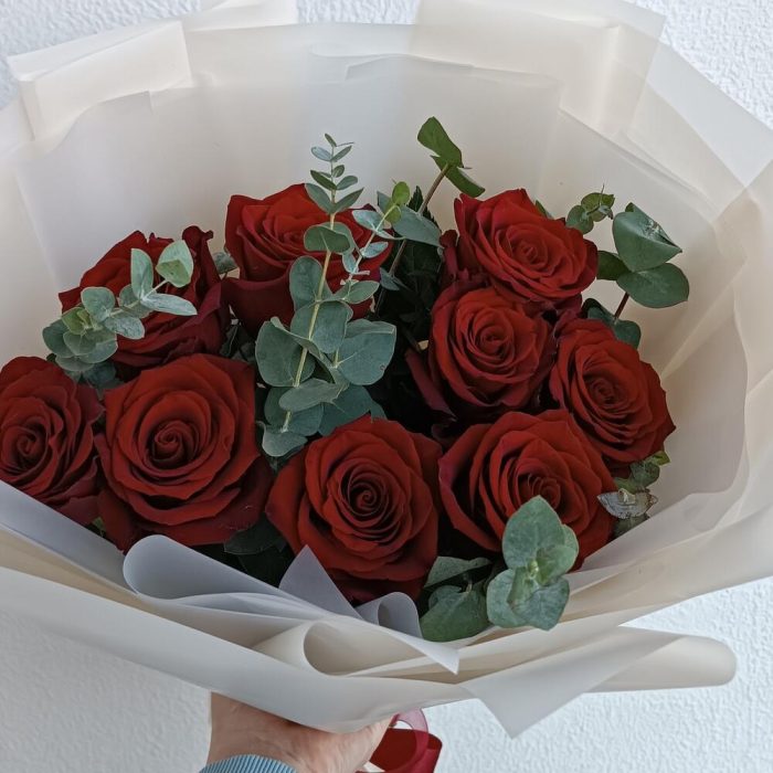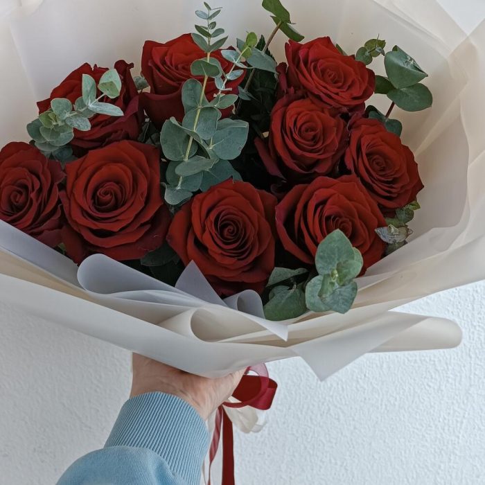 роза эквадор 70 см красная – 9 шт. Эвкалипт Микс – 3 шт. Упаковка дизайнерская – 1 шт.