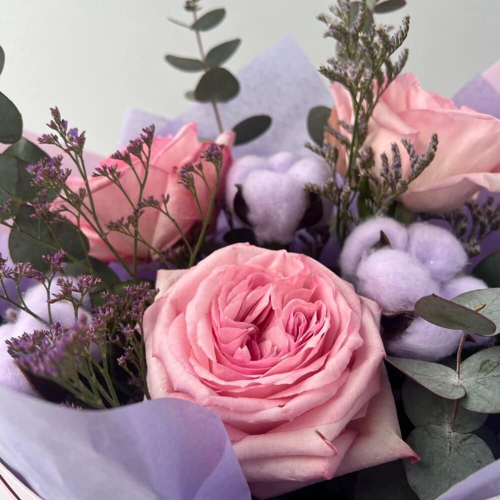 Лимониум – 1 шт.Хлопок – 3 шт.Эвкалипт – 2 шт.Лента атласная – 1 шт.Тишью – 1 шт.Фисташка – 1 шт.Фоамиран (упаковка) – 1 шт.роза пинк охара(ароматная) – 3 шт.