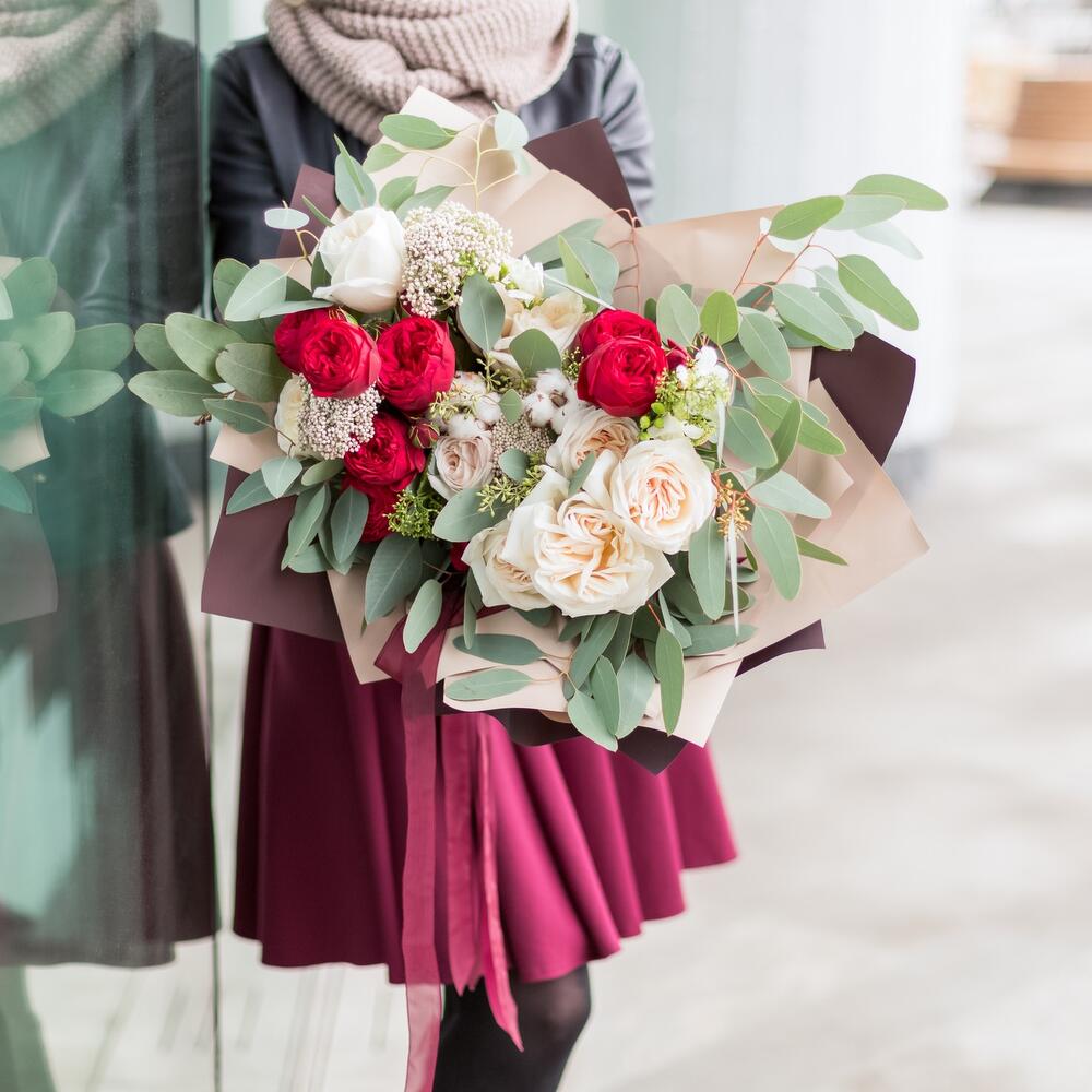 Озотамнус – 4 шт.Эвкалипт Микс – 8 шт.пионовидные розы red piano – 9 шт.пионовидные молочного оттенка – 9 шт.