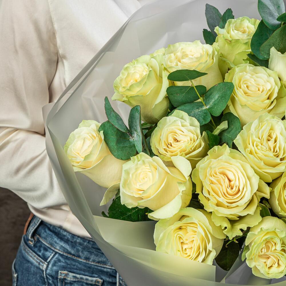 Роза одноголовая – 15 шт.Эвкалипт – 1 шт.Подарочная упаковка – 1 шт.средство для продления жизни срезанных цветов – 1 шт.