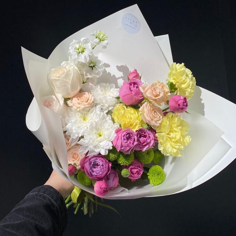 Гвоздики, Кустовые розы, Пионовидные розы, Розы