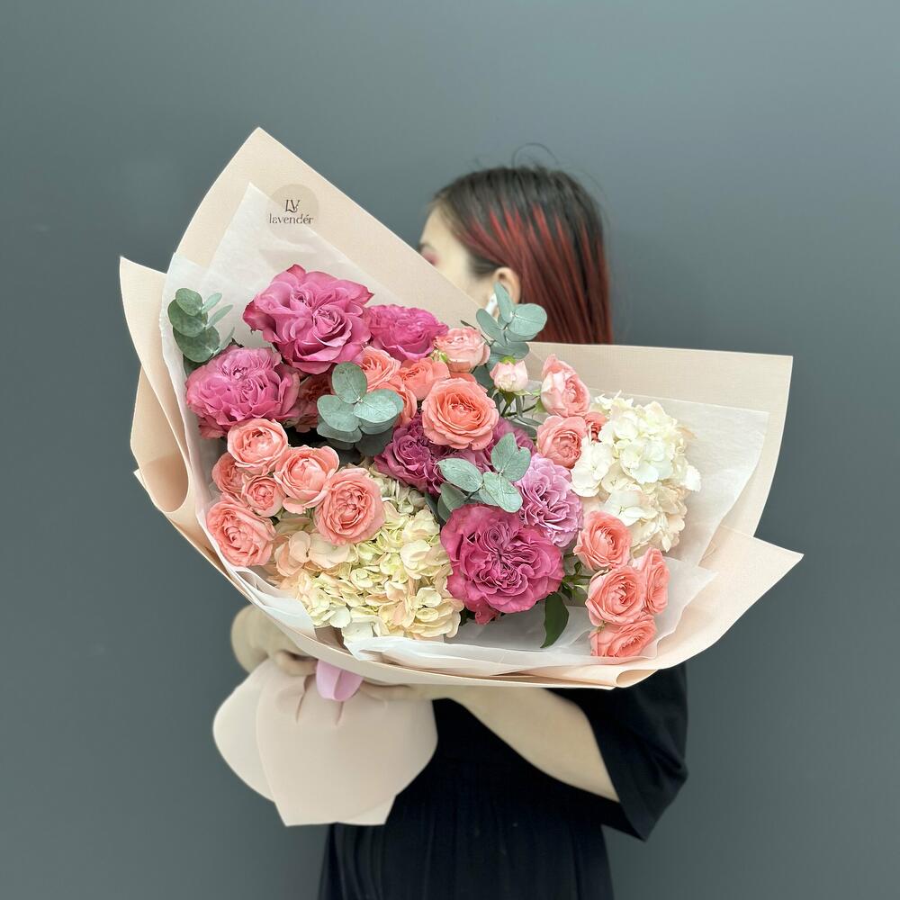 Гвоздики, Лизиантусы, Розы, Тюльпаны