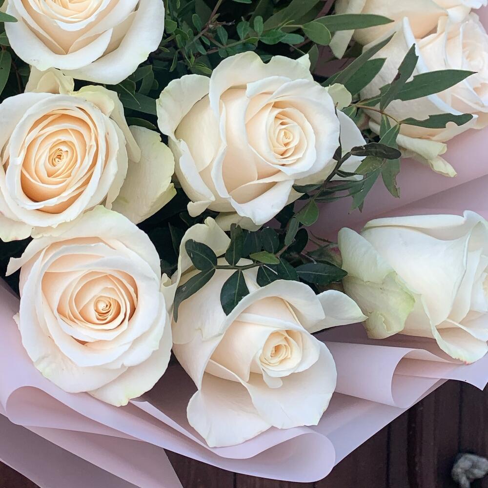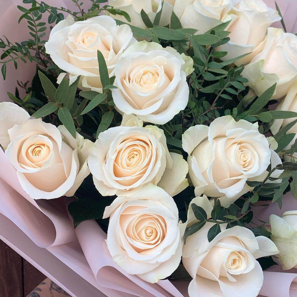 Букет из 15 белых роз с эвкалиптом
