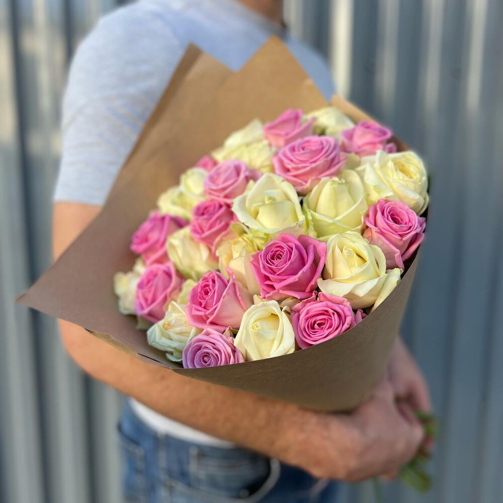 Роза розовая 60 см – 13 шт.Крафт упаковка – 1 шт.Роза белая 60 см – 8 шт.