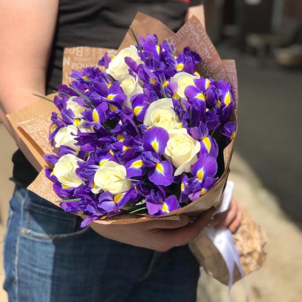 Букет из 30 синих ирисов и 9 белых роз