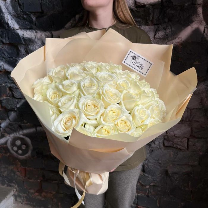 Букет из 35 белых роз в стильной упаковке “Авива”