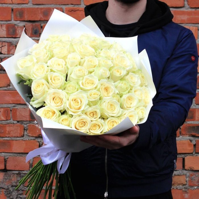 Роза Аваланж – 51 шт.Лента атласная – 1 шт.упаковочный материал – 3 шт.