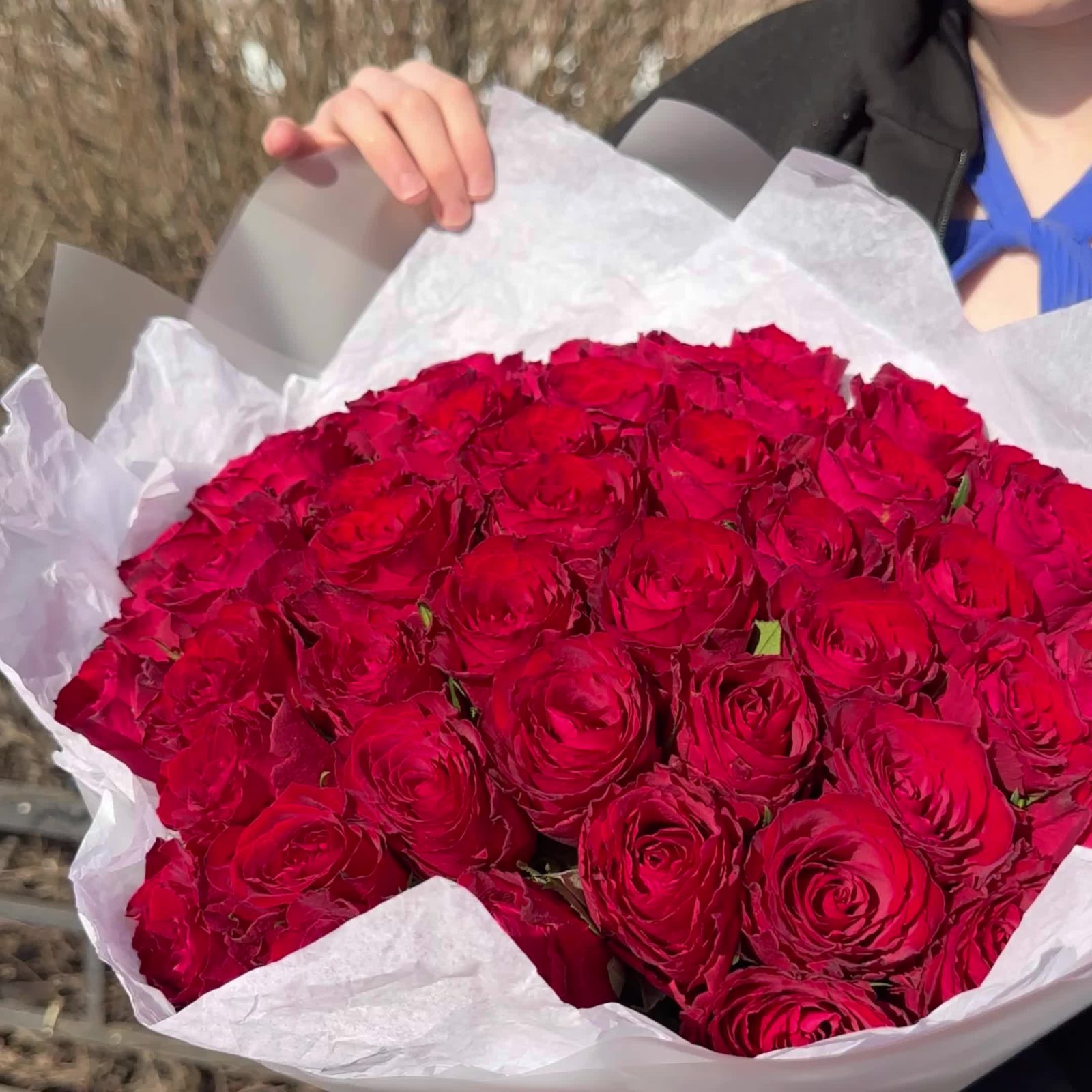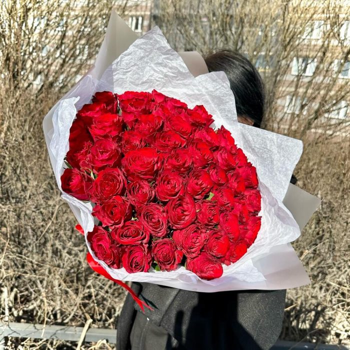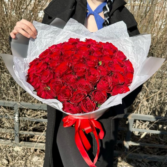 Роза – 51 шт.Лента атласная – 1 шт.Крафт – 3 шт.Открыточка с вашими пожеланиями – 1 шт.