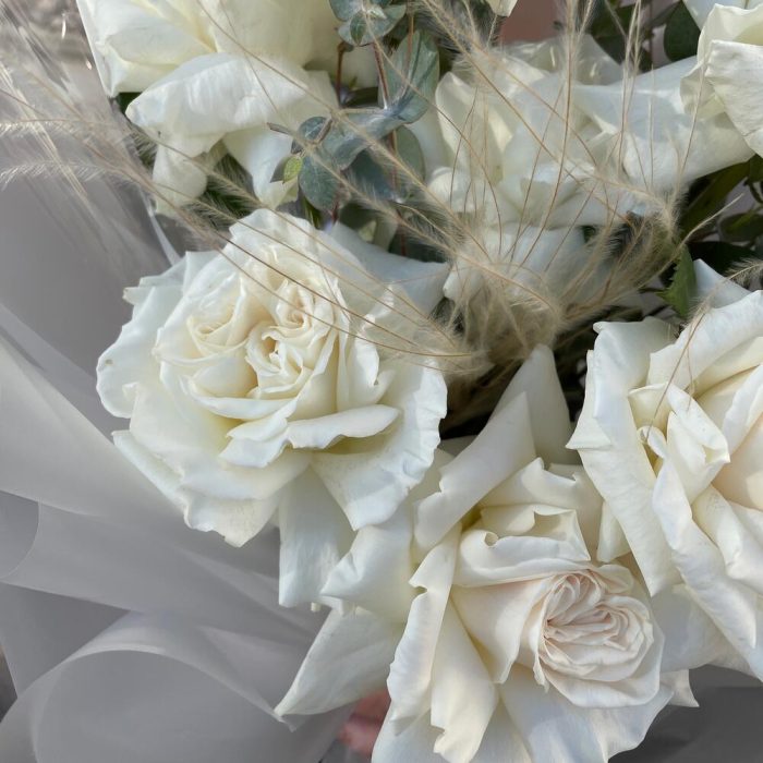 Эвкалипт – 4 шт.Роза – 9 шт.Лента атласная – 2 шт.Упаковка дизайнерская – 6 шт.Ковыль – 1 шт.