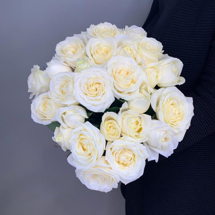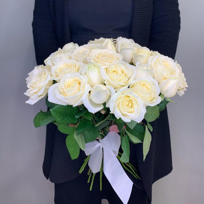 Классический букет из 25 белых роз можно подарить понравившейся девушки, также прекрасным поводом для данного букета будет первое свидание или подарок на свадьбу.