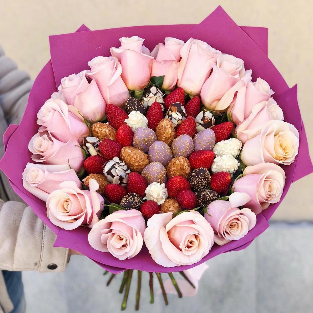 Клубника в шоколаде callebaut (бельгия) – 24 шт.Клубника – 17 шт.Роза Эквадор – 17 шт.Упаковка – 1 шт.Атласная лента – 1 шт.