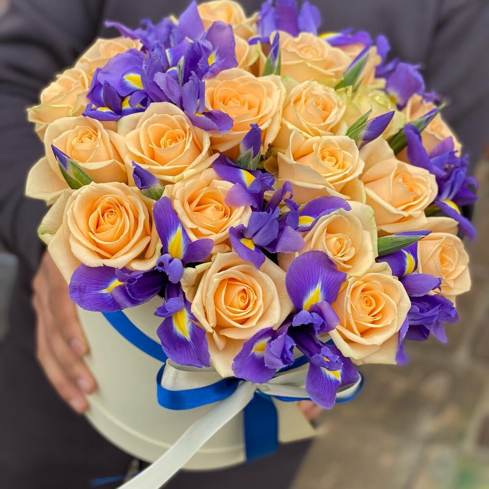 Ирис – 19 шт.Лента атласная – 2 шт.Коробка шляпная – 1 шт.Оазис флористический – 1 шт.Роза кремовая 50 см – 20 шт.