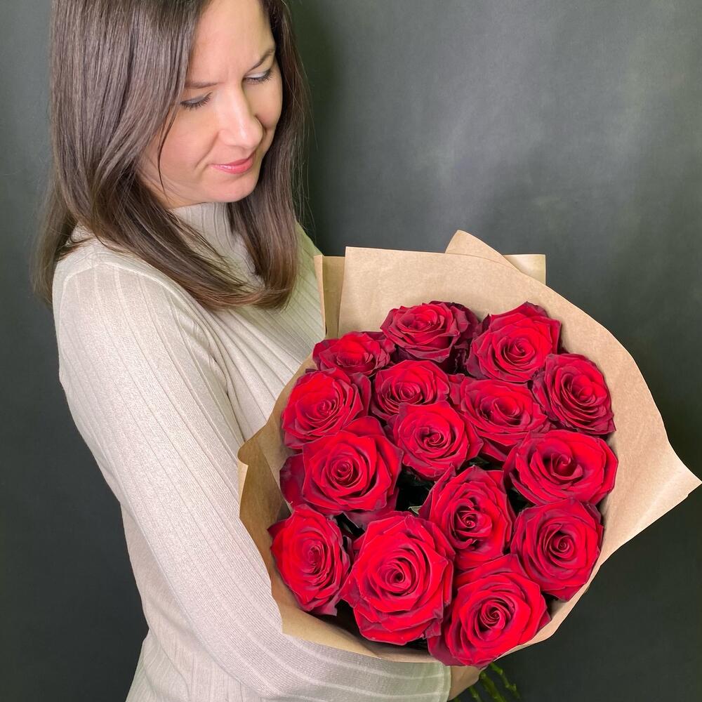 Роза Эквадор – 15 шт.Крафт упаковка – 3 шт.Лента атласная – 1 шт.