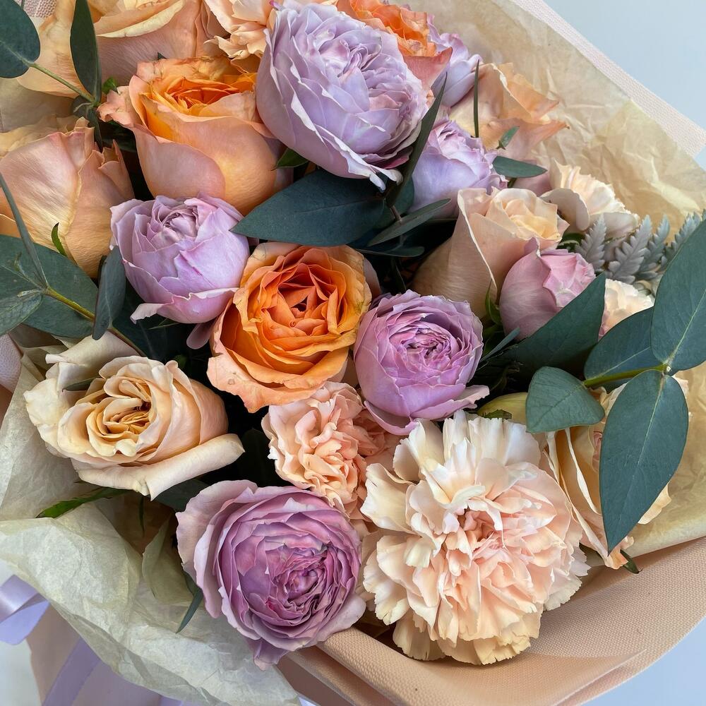 Папоротник – 3 шт.Эвкалипт – 2 шт.Роза – 8 шт.Кустовая роза – 2 шт.Диантус – 5 шт.Оформление – 2 шт.