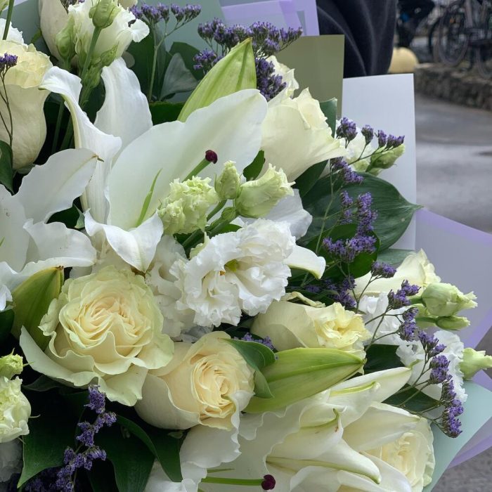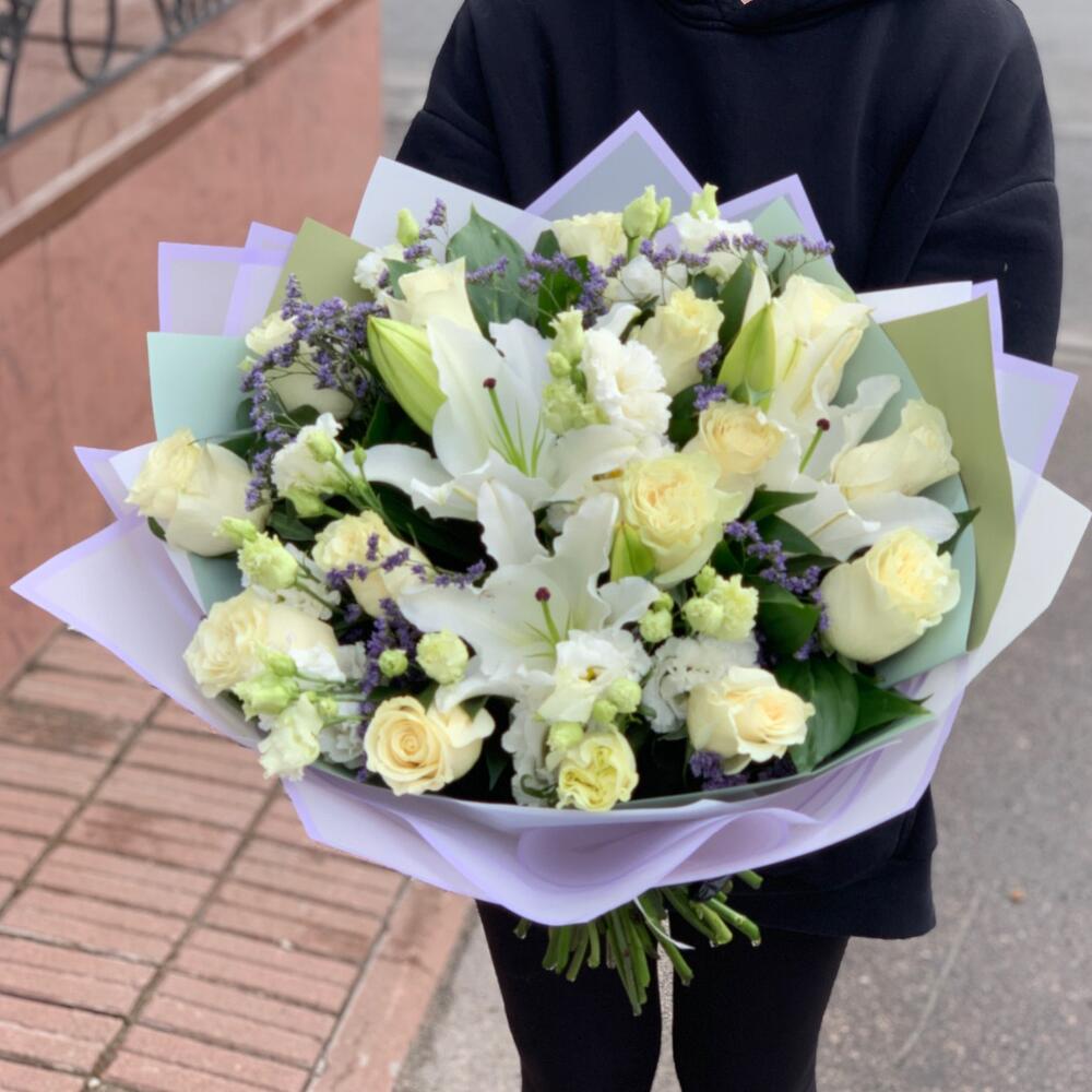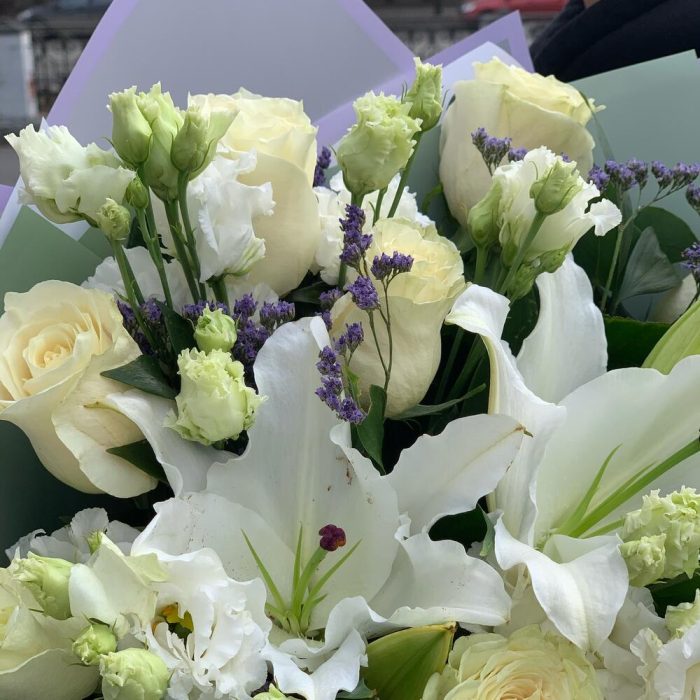 Роза – 15 шт.Лилия – 2 шт.Лизиантус – 4 шт.Лимониум – 2 шт.руссус – 20 шт.Дизайнерская упаковка – 2 шт.