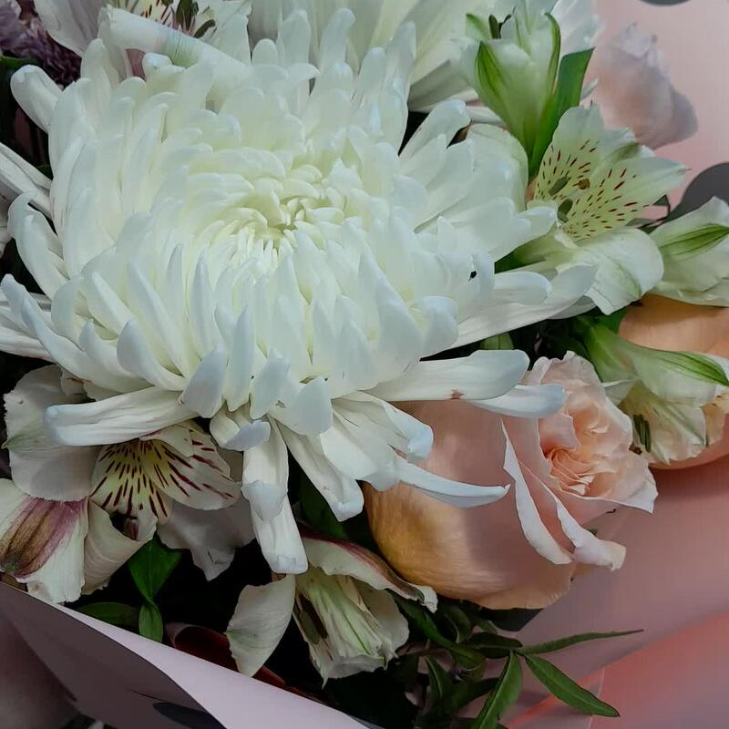 Альстромерия – 3 шт.Хризантема кустовая – 1 шт.Роза – 3 шт.Хризантема – 2 шт.Лента атласная – 2 шт.Фисташка – 2 шт.Упаковка дизайнерская – 2 шт.
