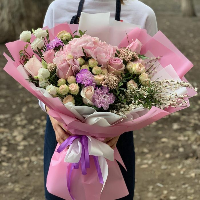 Букет цветов в фиолетовых, розовых и кремовых тонах