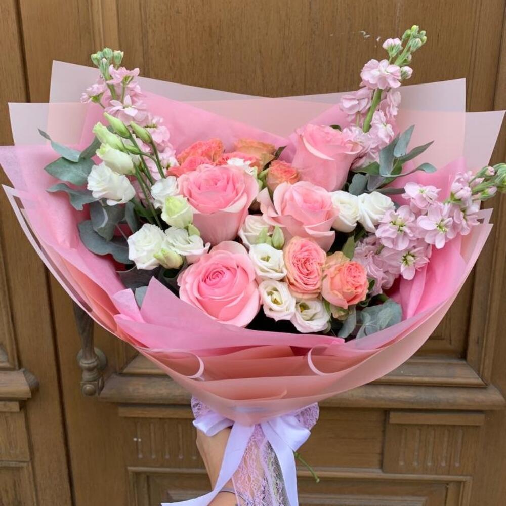 Роза розовая – 4 шт.Роза кустовая – 2 шт.Лизиантус – 2 шт.Маттиола – 3 шт.Дизайнерская упаковка – 1 шт.октрыточка с вашими пожеланиями – 1 шт.Шоколадка – 1 шт.