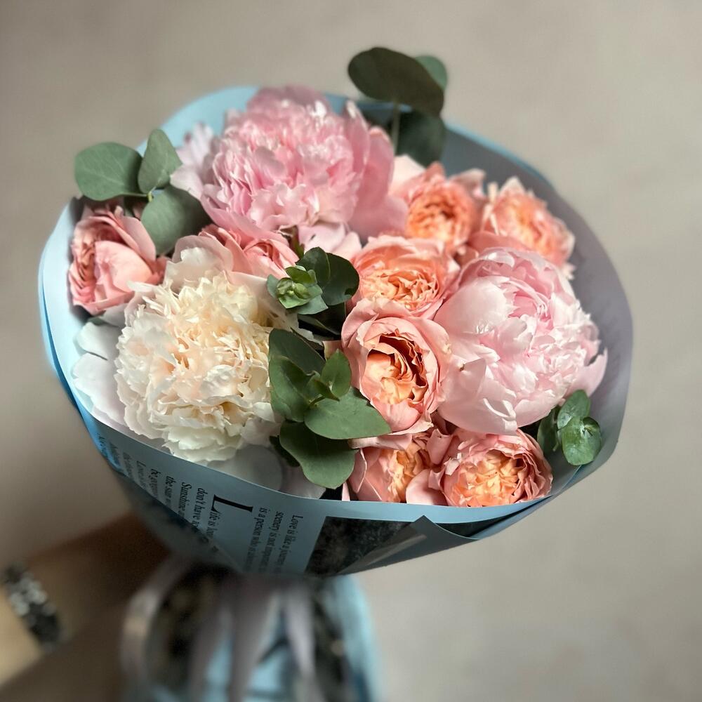 Эвкалипт – 5 шт.Атласная лента – 1 шт.Кустовая пионовидная роза – 2 шт.декоративная упаковка – 1 шт.пионы – 3 шт.