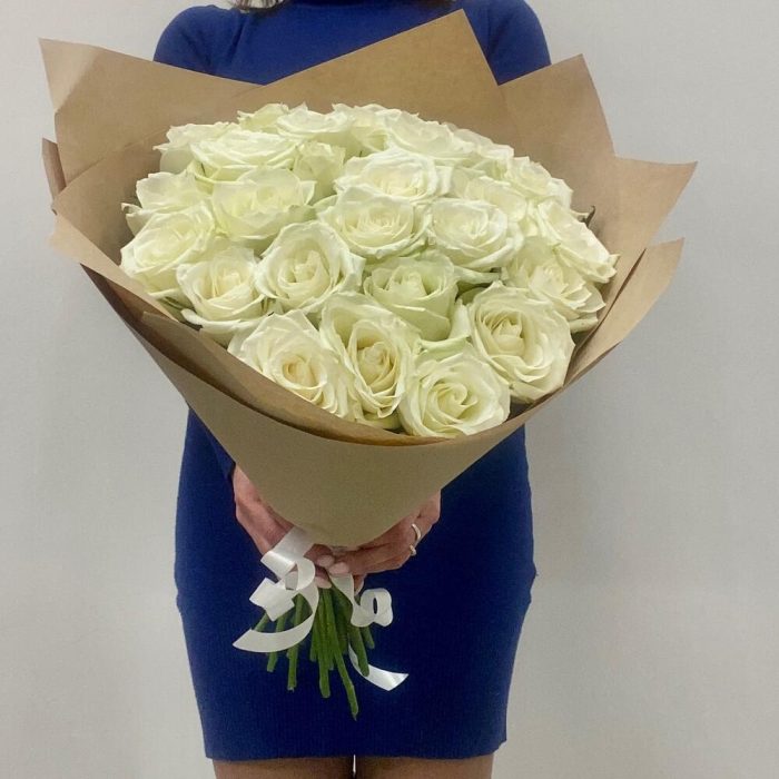 Роза белая – 25 шт.Упаковка крафт – 1 шт.Лента – 1 шт.