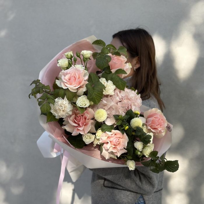 Гортензия – 1 шт. Роза – 5 шт. Спрей роза – 4 шт. георгин – 2 шт. ветка малины – 5 шт.