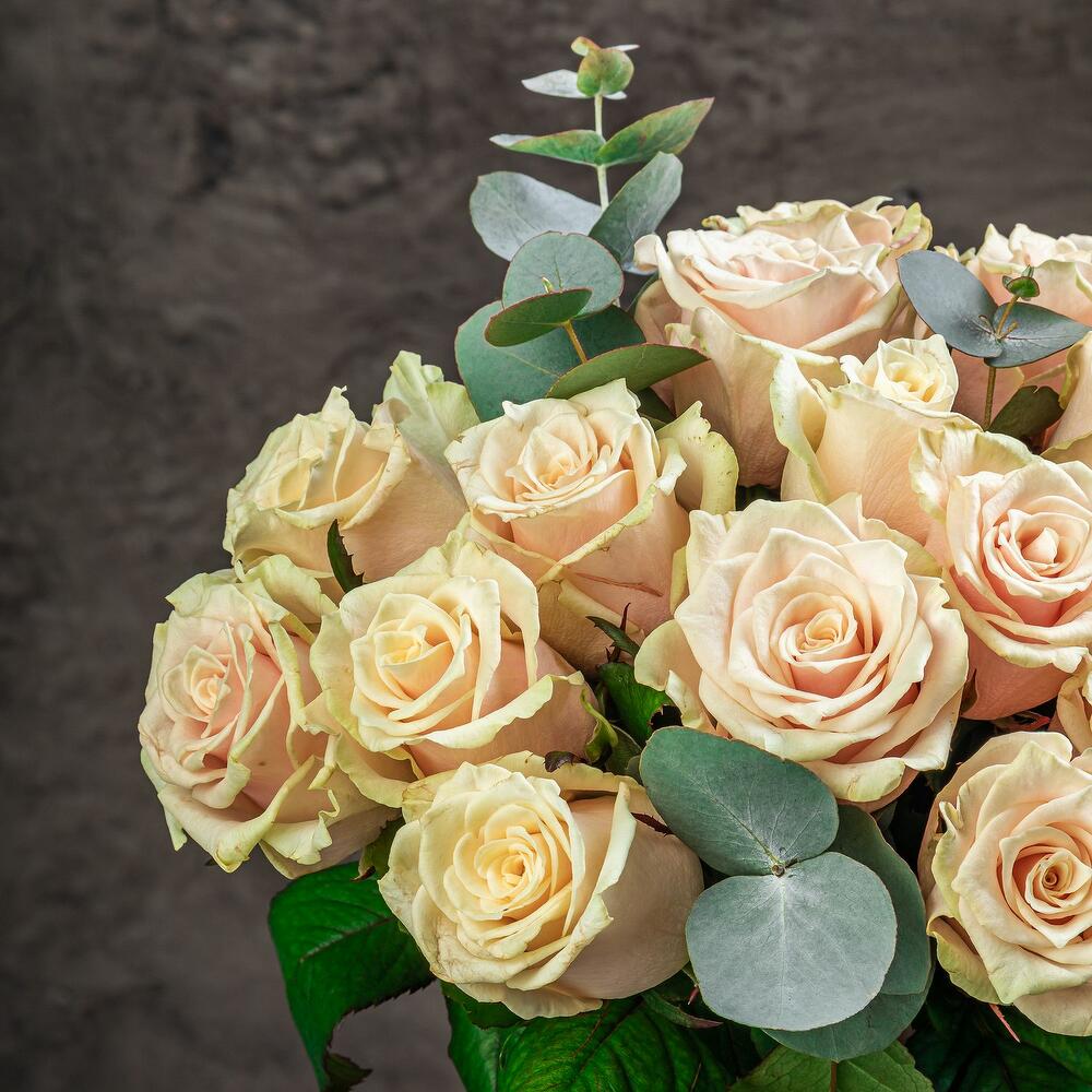 Букет в вазе из чайных роз с эвкалиптом в вазе-букетнице