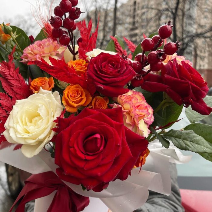 Гвоздика сортовая – 3 шт.Роза Россия 50 см – 9 шт.Ягоды декоративные – 2 шт.Оазис флористический – 1 шт.Салал пучок – 1 шт.Кустовая роза оранжевая 50 см – 2 шт.папоротник ветка – 2 шт.коробка маленькая – 1 шт.колосок полевой – 1 шт.