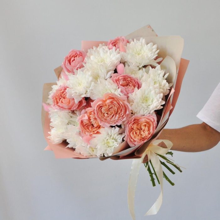 Словно нежные крылья ангела – невероятное сочетание красивых пионовидных роз и белоснежной хризантемы.Такой букет станет отличным поводом сказать девушке, маме или бабушке, как вы дорожите ей и цените её