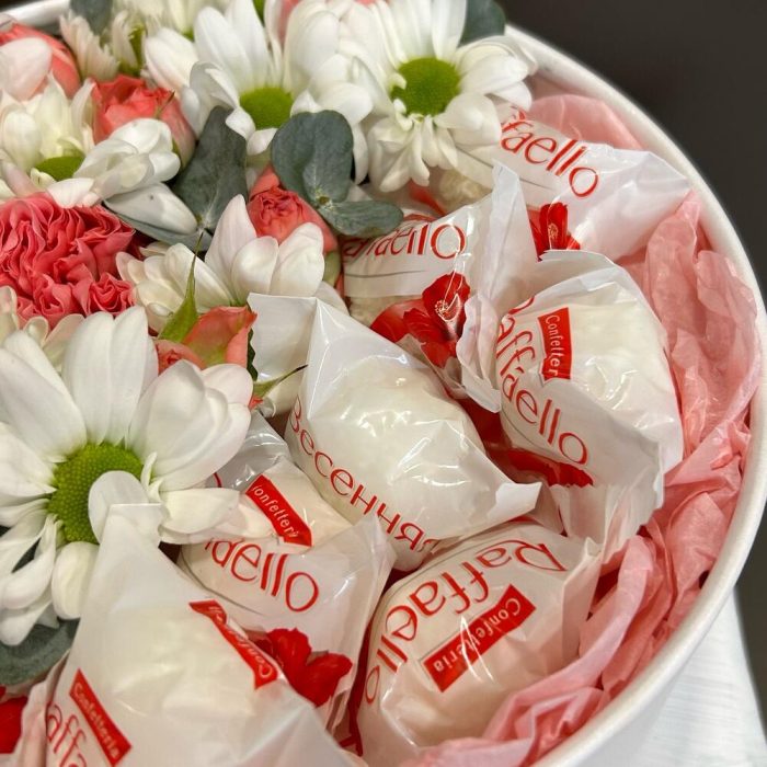 Пиафлор (оазис) – 1 шт.Роза кустовая – 2 шт.Хризантема кустовая – 1 шт.Раффаэлло – 8 шт.Коробка – 1 шт.Упаковка дизайнерская – 2 шт.зелень декоративная – 1 шт.