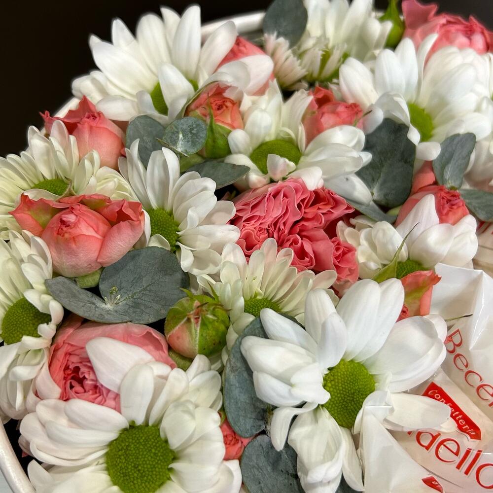Композиция в коробке из белой кустовой хризантемы, кустовой розы и рафаэлло